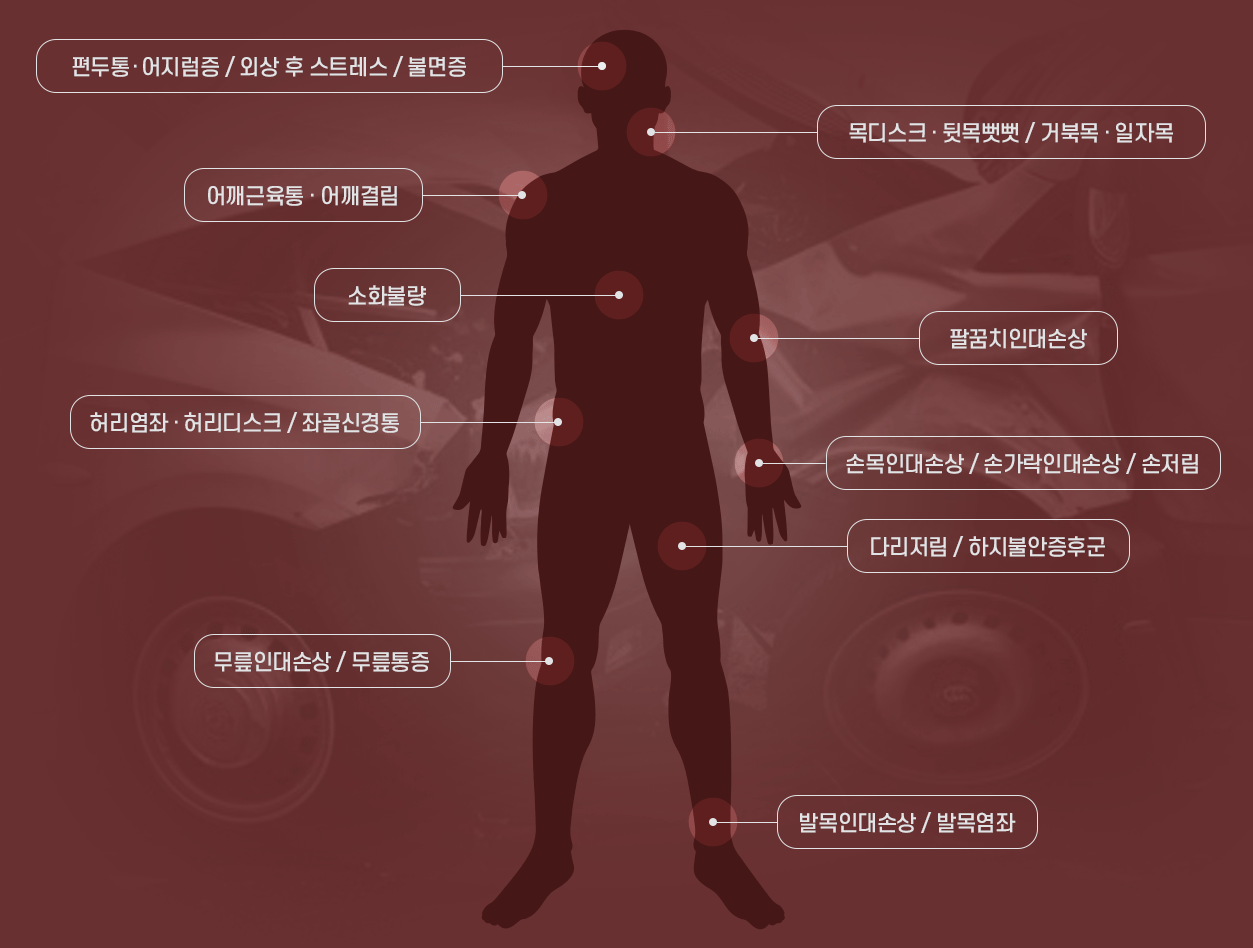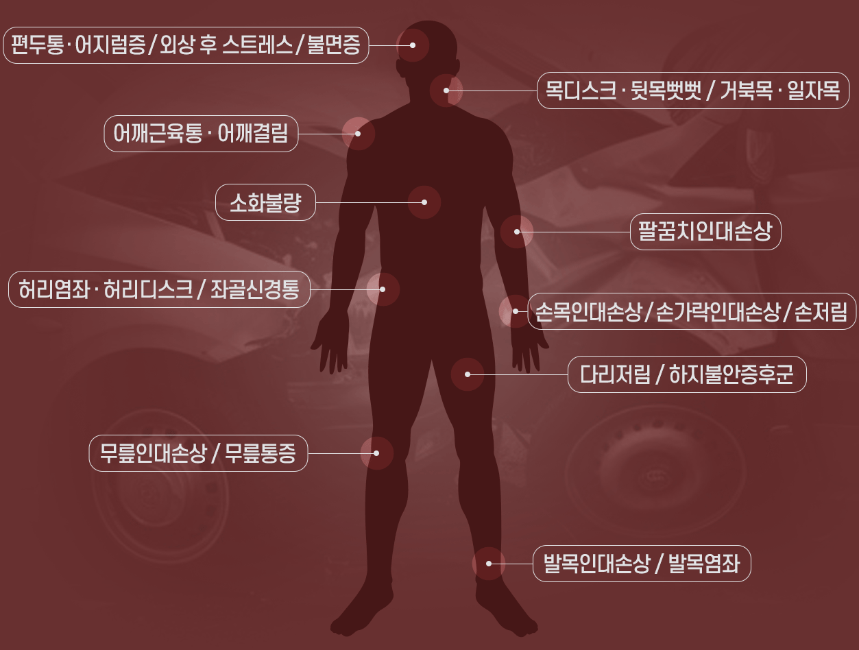- 교통사고로 발생한 후유증과 통증에 대해 의료진이 세심하게 진료해드립니다. |